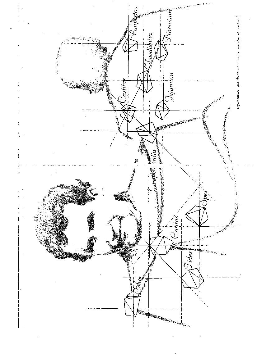 The other five diamonds adorned the back of the mantle and were arranged thus: one very large and brighter one was in the middle, like at the centre of a square, and it bore the inscription Obedientia. On the first on the right one could read Votum Paupertatis. On the second a little lower, Praemium. On the left higher up was inscribed Votum Castitatis with a dazzling splendour all of its own and looking at it attracted and held the attnetion like a magnet attracts metal. On the second on the left lower down was written Ieiunium. All four of these directed their rays of light towards the diamond at the centre.